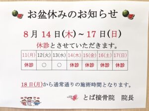 さて、今回はお盆期間中の休診のお知らせです。